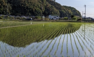 田んぼに水が張られ、風景を映し出し、時折空の青さをも投影し、すばらしい風景の中、出勤します。